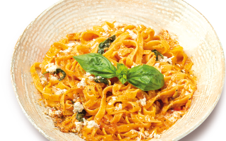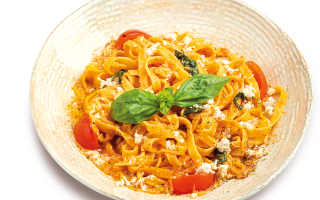 Pasta tagliatelle, piept de pui, telemea de oi, roșii cherry, sos pentru pizza, spanac, busuioc, ceapă, usturoi, ulei vegetal de floarea-soarelui, sare iodată, piper negru măcinat, oregano.