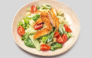 MIX SALATĂ, ROȘII CHERRY, CASTRAVE I PROASPE I, PIEPT DE PUI PANE (PIEPT DE PUI 25%, |280 g 38 LEI Ţ FĂINĂ DE GR U 000, PESMET, SARE IODATĂ, PIPER NEGRU MĂCINAT), CRUTOANE DIN PÂINE, Â SOS CEZAR*, PIPER NEGRU MĂCINAT. INFORMAŢII NUTRIŢIONALE 100G VALOARE ENERGETICĂ (KJ/KCAL): 563.4 / 135.7, GRĂSIMI: 9.2G DIN CARE: ACIZI GRAȘI SATURA I .3G, GLUCIDE: 9G DIN CARE: ZAHARURI: 4.1G, PROTEINE: .1G, SARE: 0.5G Ţ 0 ALERGENI: GLUTEN