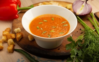 Supă de legume, cartofi, ceapă, morcov, țelină, ulei vegetal de floarea-soarelui, ardei gras, bacon afumat, usturoi, smântână, ou, bors acru, sare iodată, piper negru măcinat, tarhon uscat, pătrunjel proaspăt.